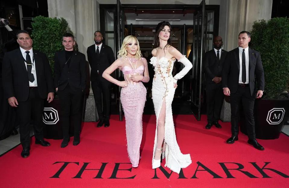 图片拍摄于纽约,2023年5月1日。多纳泰拉·范思哲和安妮·海瑟薇于当天离开纽约马克酒店参加2023 Met Gala。图片来源:Ilya S. Savenok/Getty Images for The Mark