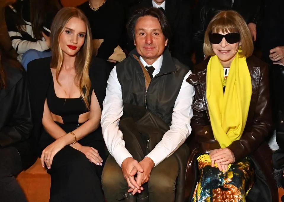 图片拍摄于法国巴黎,2023年3月4日。从左至右分别是罗茜·亨廷顿-怀特利(Rosie Huntington-Whiteley)、爱马仕首席执行官阿克塞尔·杜马斯(Axel Dumas)和安娜·温图尔(Anna Wintour)。他们在法国巴黎共和国宫参加爱马仕AW23女装T台秀。 图片来源:Dave bennett /Getty Images forHermès