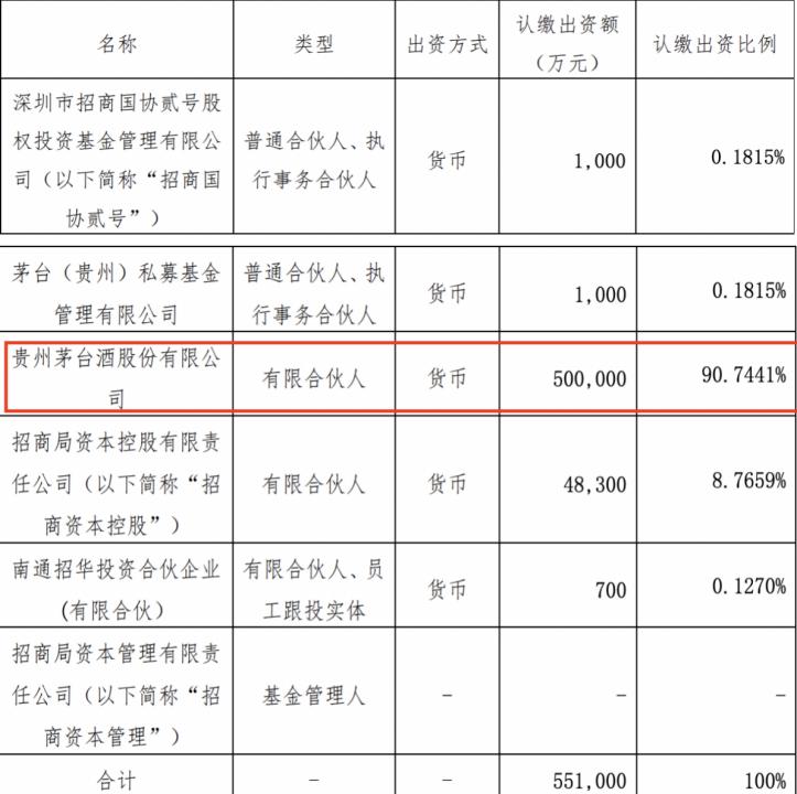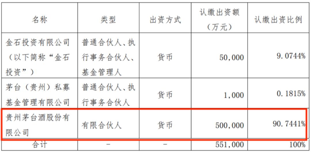 而第二只——茅台金石基金,由金石投资和茅台基金公司共同为普通合伙人和执行事务合伙人,基金管理人由金石投资担任,贵州茅台酒股份有限公司为有限合伙人。其中,贵州茅台同样认缴出资50亿元。
