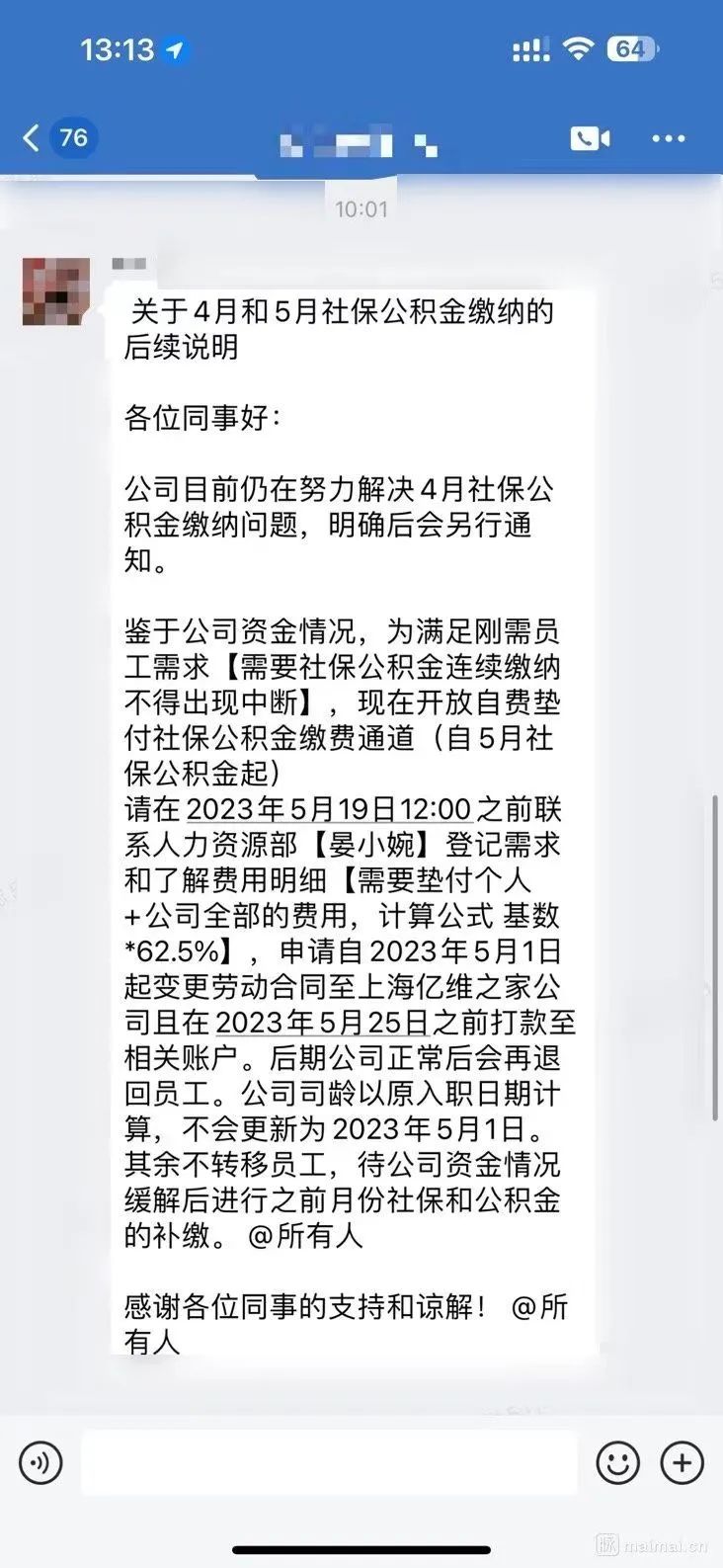 不仅如此,自费垫付的员工还需要变更自身劳动合同。通知称,自费垫付社保公积金的员工需要自2023年5月1日起变更劳动合同至上海亿维之家公司且在2023年5月25日之前打款至相关账户,后期公司正常后再退回。