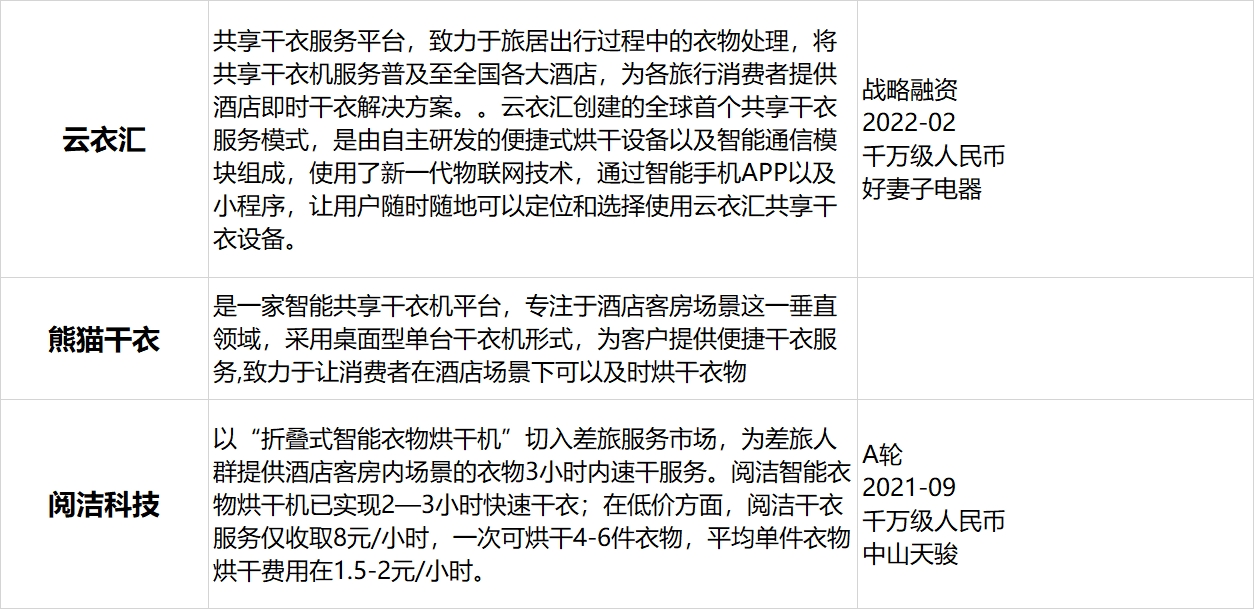 根据全国家用电器工业信息中心数据显示,2022年独立干衣机产品国内零售额达到83亿元,同比增长12.3%,消费者对烘干需求不断提升。与海豚干衣处于同一赛道的公司还有:云衣汇客房干衣机、熊猫干衣、阅洁科技等。