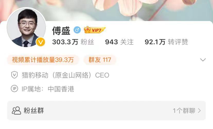 傅盛的微博仍有300余万粉丝