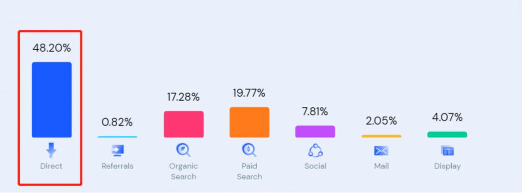 SHEIN目前已经成为了独立、自足的互联网(电商)流量入口。以SHEIN美国站的桌面端网站为例,其直接流量(Direct traffic,即直接访问的非付费流量),占48.2%,接近总流量的一半了,而付费流量(Paid Search)占比要小很多,仅为19.77%。