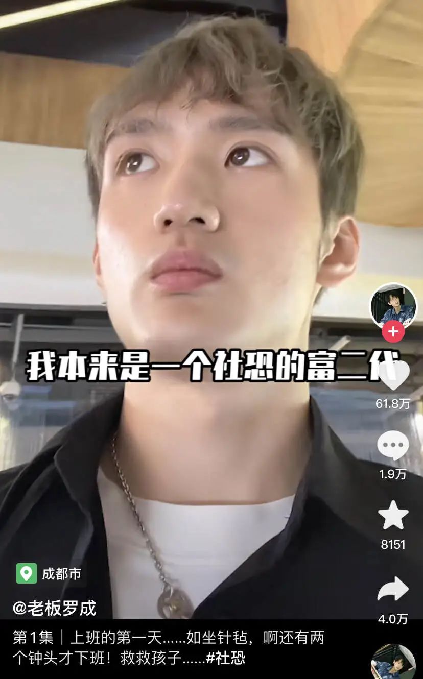 做明星比不上流量,做网红也赶不上易梦玲,但在二代里,已经算是佼佼者。2021年,罗成凭借一个“社恐富二代”的短视频迅速走红,此后借由傻白甜霸总、手艺人、反差萌等标签吸引一大批粉丝,如今抖音粉丝已达280万。