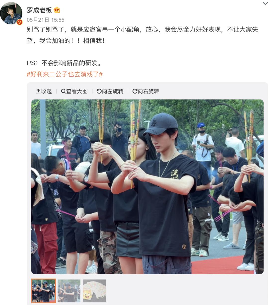 罗成的title越来越多,网红、富二代……但最重要的还是他账号中的“老板”。此次试水遭网友质疑时,他除了说“只是客串一个小配角“之余,还不忘强调一句“不会影响新品的研发”。