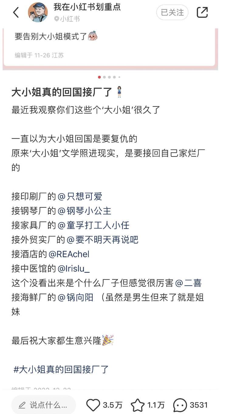 去年年底小红书流行起话题“大小姐真的回国接厂了”,多位带着光环的年轻人分享起自己接厂但毫无经验的纠结。围观网友既羡慕又满足,感觉现在关注上就可以等着看大小姐养成爽文了。