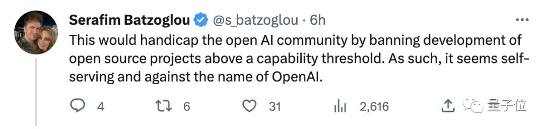 有网友认为OpenAI提出这样的举措,阻碍了开放人工智能社区的发展,这看起来是自私的,与OpenAI的名称相违背: