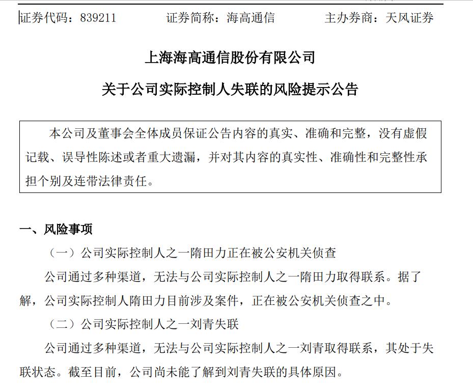 值得一提的是,2021年8月2日晚间,新三板挂牌公司海高通信(839211.NQ)的一则公告显示,隋田力已处于失联状态。“据了解,公司实际控制人隋田力目前涉及案件,正在被公安机关侦查之中。”