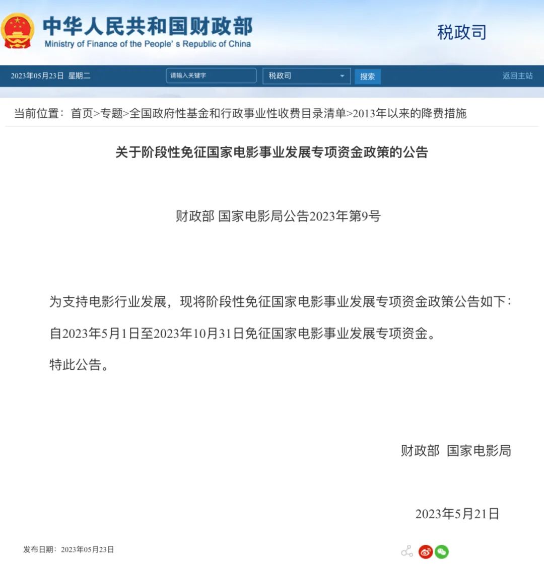 5月23日,财政部、国家电影局联合发布关于阶段性免征国家电影事业发展专项资金政策的公告。为支持电影行业发展,将阶段性免征国家电影事业发展专项资金,自2023年5月1日至2023年10月31日免征国家电影事业发展专项资金。
