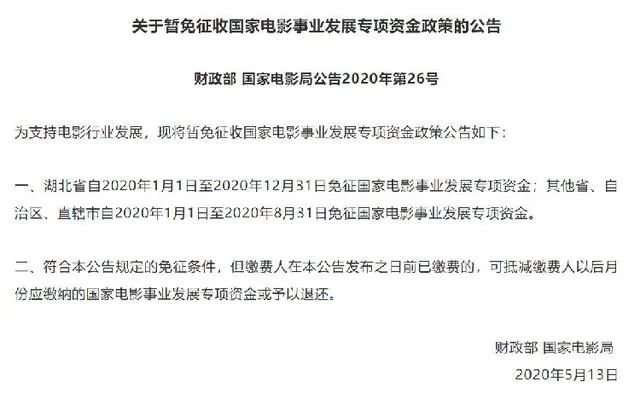 当时公告宣布湖北省自2020年1月1日至2020年12月31日免征国家电影事业发展专项资金;其他省、自治区、直辖市自2020年1月1日至2020年8月31日免征国家电影事业发展专项资金。
