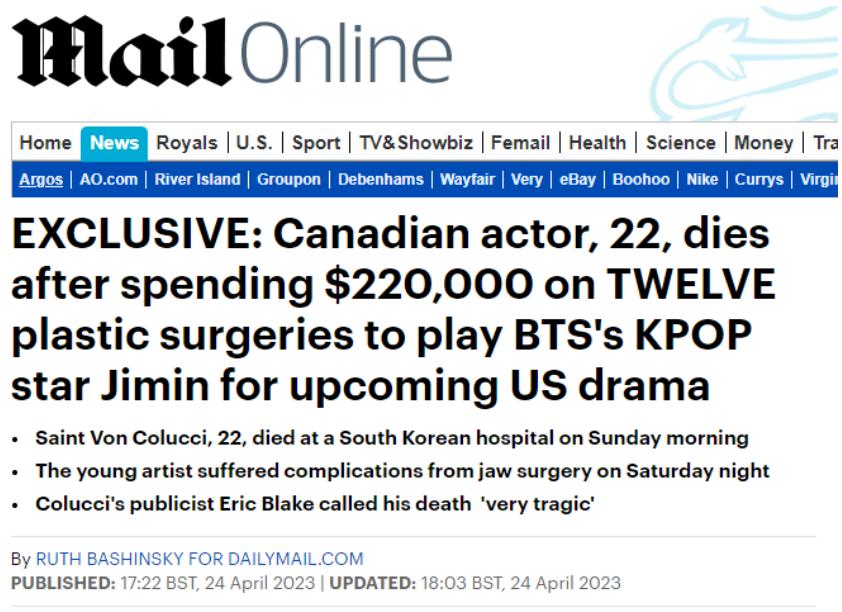 英国《每日邮报》(The DailyMail)曾在4月24日刊登过一则新闻,称“一位22岁的加拿大男子为在韩国以偶像身份出道而整容12次,最终丧命”。