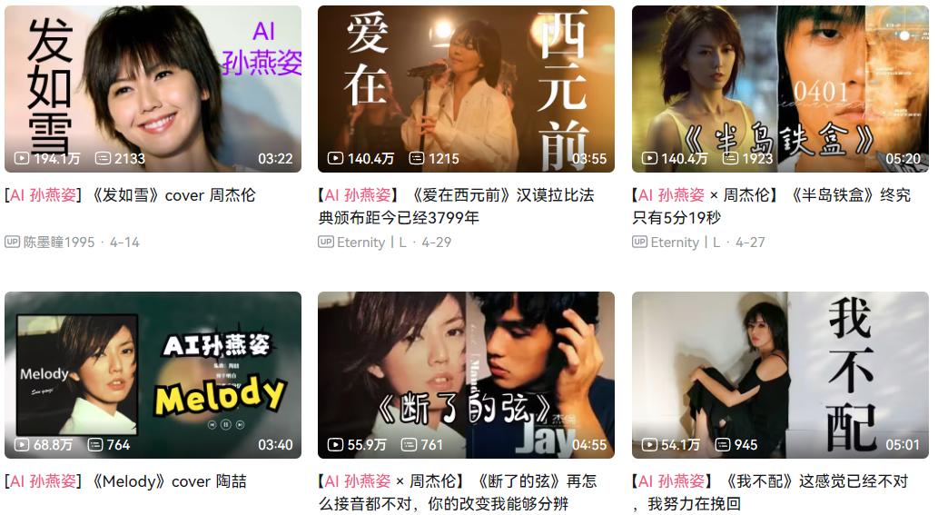 而孙燕姿也并非是唯一一位被“AI翻唱”的歌手,还有AI周杰伦、AI王心凌、AI腾格尔等人陆续出现。