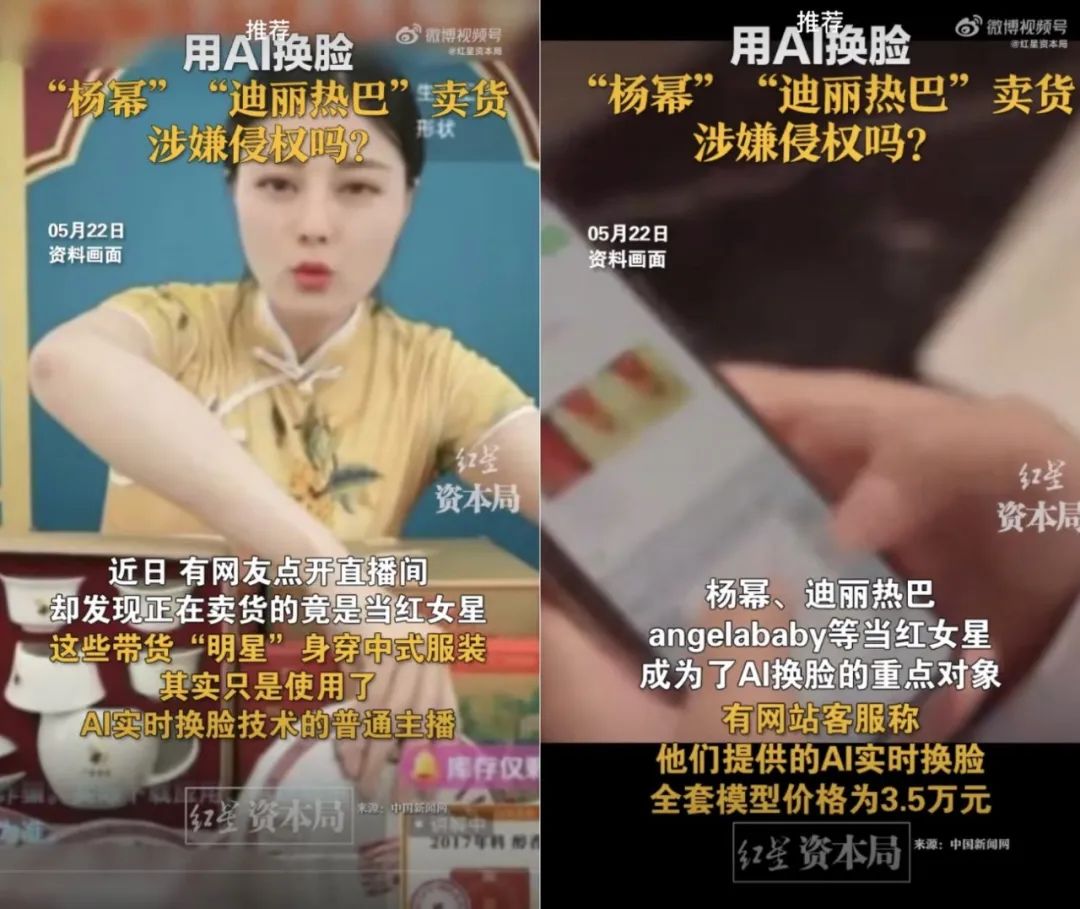据中国新闻网报道,近日,有多个直播间都开始采用AI换脸明星的方式进行直播带货,女明星如杨幂、迪丽热巴、Anglebaby等人成了重点换脸对象,明星脸的带货主播能达到更好的引流效果,并节省广告宣传成本,消费者或明星粉丝可能会冲着明星效应进行消费而被坑骗。