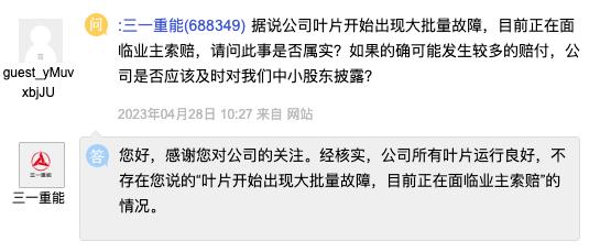 三一重能:公司所有叶片运行良好,不存在“叶片开始出现大批量故障面临业主索赔”的情况
