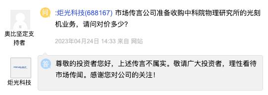 炬光科技:传言“公司准备收购中科院物理研究所的光刻机业务”不属实