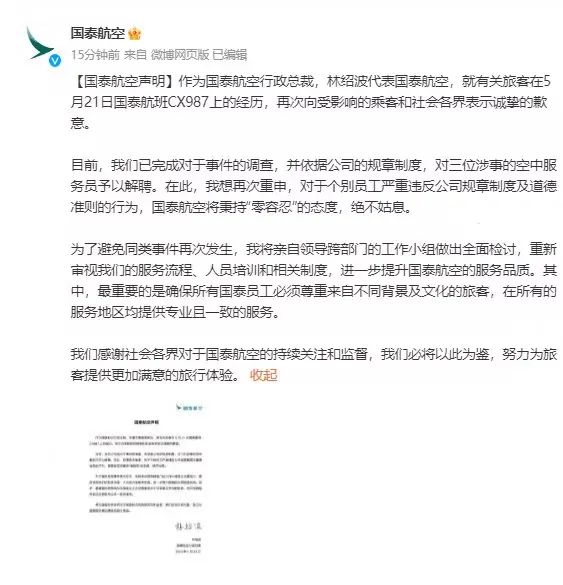 据国泰航空:作为国泰航空行政总裁,林绍波代表国泰航空,就有关旅客在5月21日国泰航班CX987上的经历,再次向受影响的乘客和社会各界表示诚挚的歉意。目前,我们已完成对于事件的调查,并依据公司的规章制度,对三位涉事的空中服务员予以解聘。(九派新闻,红星新闻)