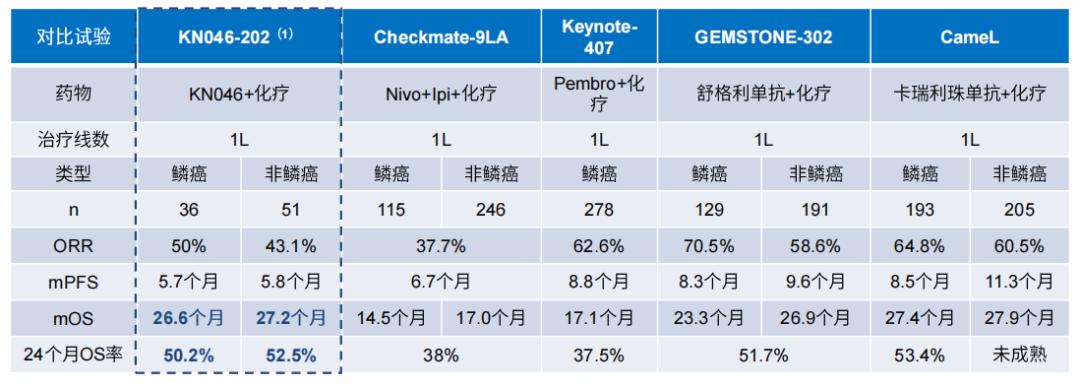 没有头对头试验,KN046只能作为PD-1抑制剂的补充疗法,商业化前景将被严重限制。也就是说,KN046如果想在鳞状NSCLC上有所作为,那么与PD-1抑制剂的头对头试验就是一个不得不做的试验,它必须向市场证明KN046的疗效要明显优于PD-1抑制剂才行。