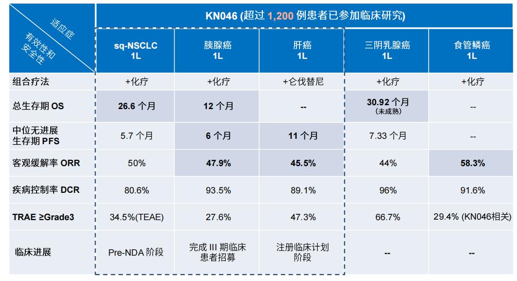 这意味着,在胰腺癌临床中将不会出现如KN046-301中存在的强大后线疗法干扰的问题。如果KN046能够拿下胰腺癌,那么有望成为这一适应症的核心疗法,无疑具备更大的市场价值,将成为决定公司营收天花板的关键。