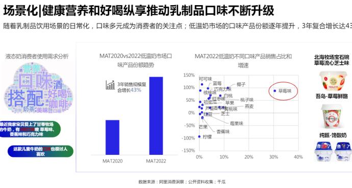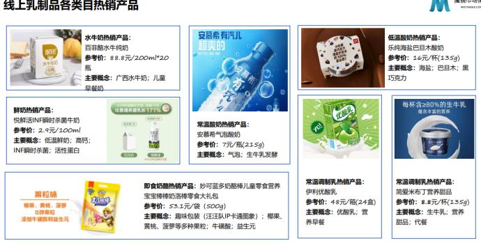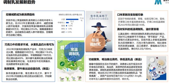 从消费趋势看,据魔镜数据,以2022年线上乳制品市场为例,白奶市场份额远超酸奶,且增长表现优于酸奶,常温/低温调制乳品(风味奶)、低温鲜奶、低温酸奶虽然基数小,但增速优于整体线上大盘。