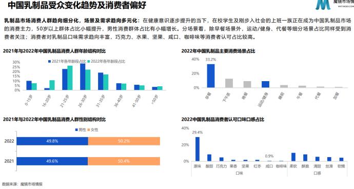 据魔镜数据,2022年中国乳制品消费中,有近7成消费者更偏好液体乳(即白奶+酸奶+风味乳),而乳粉、乳冰淇淋亦有5成左右选择比例。