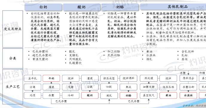 按生产工艺,乳制品可分为白奶、酸奶、奶酪、黄油/冰淇淋/炼乳/乳粉/含乳饮料等其他乳制品。液态奶包括白奶、酸奶,白奶是以生牛乳或混合奶为原料,经分离、均质、杀菌、罐装所得的液态产品,而酸奶、黄油等其他乳制品则是由杀菌乳经过发酵、搅拌等再加工工序制成。
