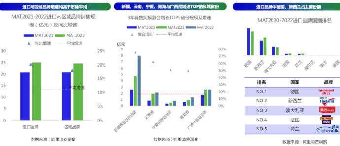 奶源地方面,以常温白奶为例。据魔镜数据,过去一年,优质奶源地广西(水牛奶)、伊犁、INF瞬时杀菌、优质乳蛋白都是增长极快的产品概念。据天猫数据,区域品牌中,新疆、云南、宁夏、青海是2020-2022年增长最快的奶源地概念,进口品牌中,德国、新西兰、澳大利亚也增长迅速。