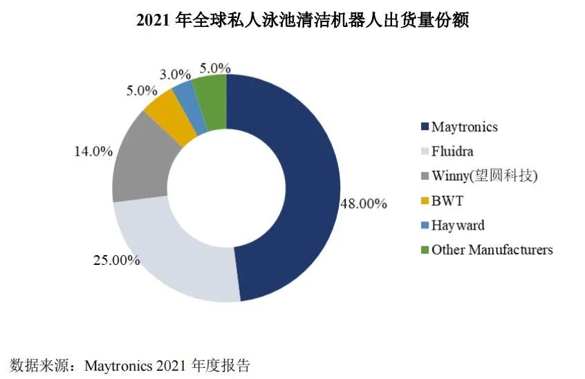 根据Maytronics披露的数据,2021年Dolphin出货量份额占全球私人泳池清洁机器人出货量的48%,国产ODM厂家望圆科技占14%排名第三。