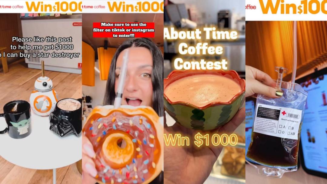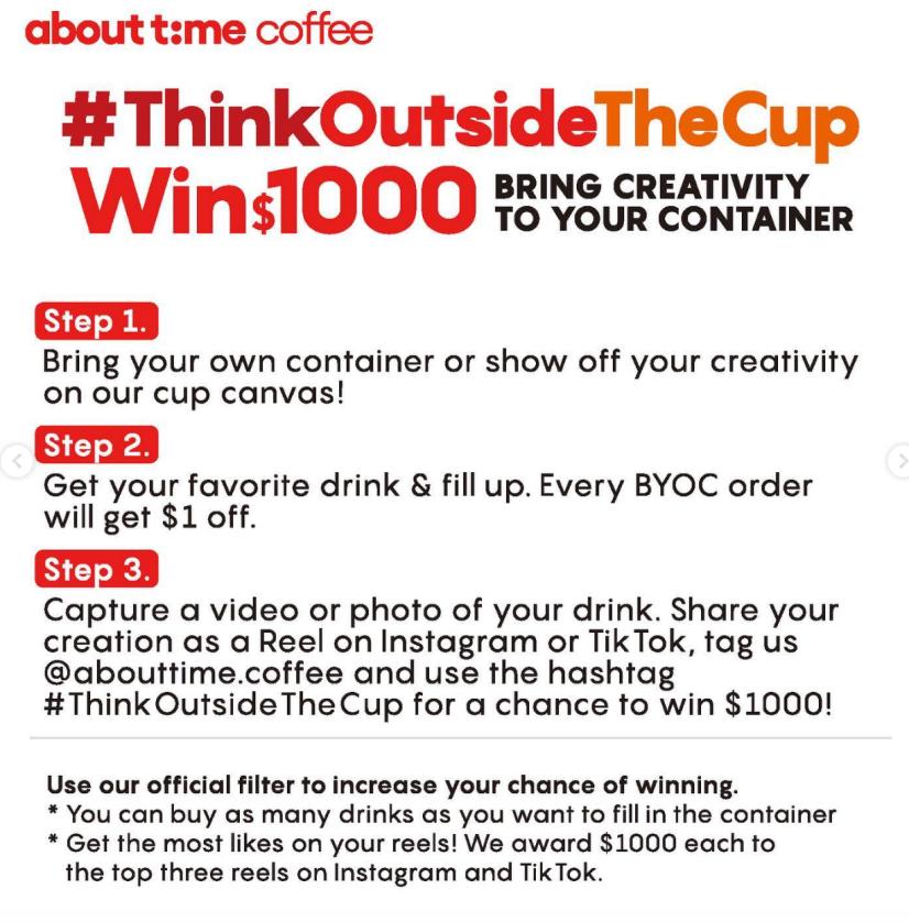 自 2023 年 3 月开始,about time 发起了创意杯子大赛,只要用户在购买 about time coffee 时自带容器,或者在官方提供的杯子上手绘自己的创意,并将装有咖啡的创意容器视频添加上@abouttime.coffee 和 #ThinkOutsideTheCup 发布至 Reels 或者 TikTok 将有机会赢得 1000 美元现金奖励。