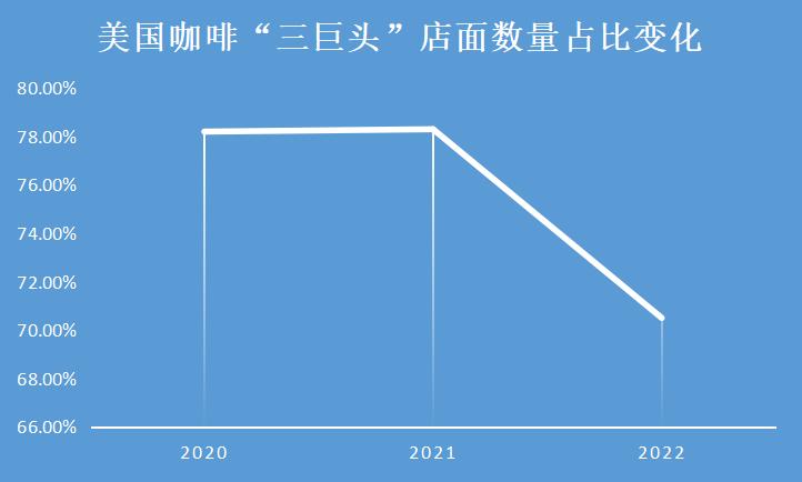 在美国咖啡市场上,长期呈现星巴克、Dunkin’、Panera“三足鼎立”的格局。2022 年,三巨头在美国的总计开店数量占总量的 70.5%。然而如果动态地来看的话,三巨头的市场影响力已经出现了下滑。