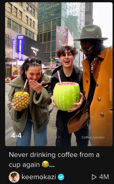1、播放量高的视频来自 TikTok 知名短视频创作者 keemokazi,有 3410 万粉丝的 keemokazi 发布了他与家人专门乘坐飞机来到曼哈顿品尝 about time coffee 的视频,视频中他和家人尝试了西瓜、橙子、辣椒、菠萝等不同容器容纳咖啡。最终该视频获得 400 万次播放量和 41.6 万次点赞。
