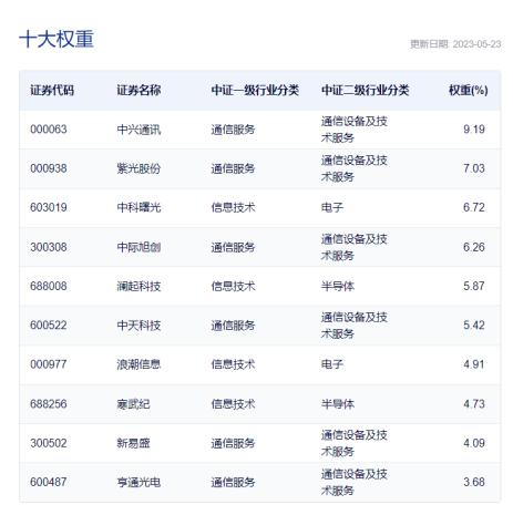 中证算力基础设施主题指数前十大权重股主要包括中兴通讯、紫光股份、中科曙光、中际旭创等。从行业分布来看,有6只属于通信板块。