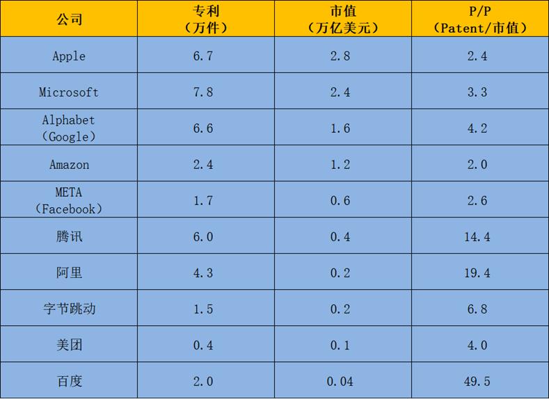 - 亚马逊和Meta市值比国内“AT”高很多,但专利又少很多;