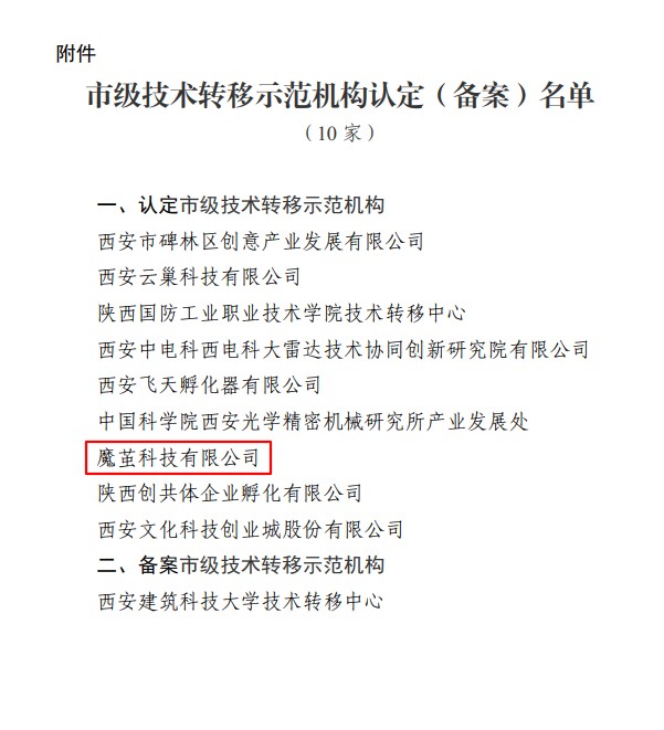 近日,西安市科学技术局公布了《关于认定(备案)市级技术转移示范机构的通知》(市科发〔2023〕57号),魔茧科技有限公司被评定为全市9家新认定技术转移示范机构之一,这是被认定为西咸新区首批10家科技服务示范机构之后,对魔茧科技服务模式的又一次认可。