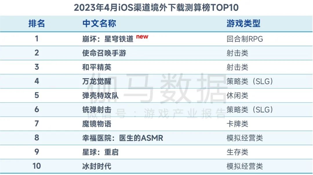 2023年4月iOS渠道境外下载测算榜TOP10中,新品《崩坏:星穹铁道》登顶,该产品上线前已积累较多热度,预下载阶段即进入多个国家或地区App Store免费榜TOP1。