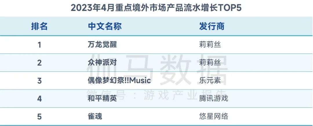 2023年4月,伽马数据移动游戏流水测算榜TOP10中前6款产品排名不变,包含3款回合制RPG类产品,2款新游上榜。