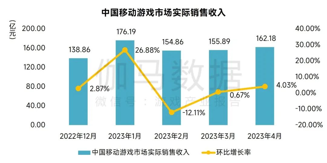 2023年4月,中国移动游戏市场实际销售收入162.18亿元,环比上升4.03%,同比下降4.37%,新品表现较优。