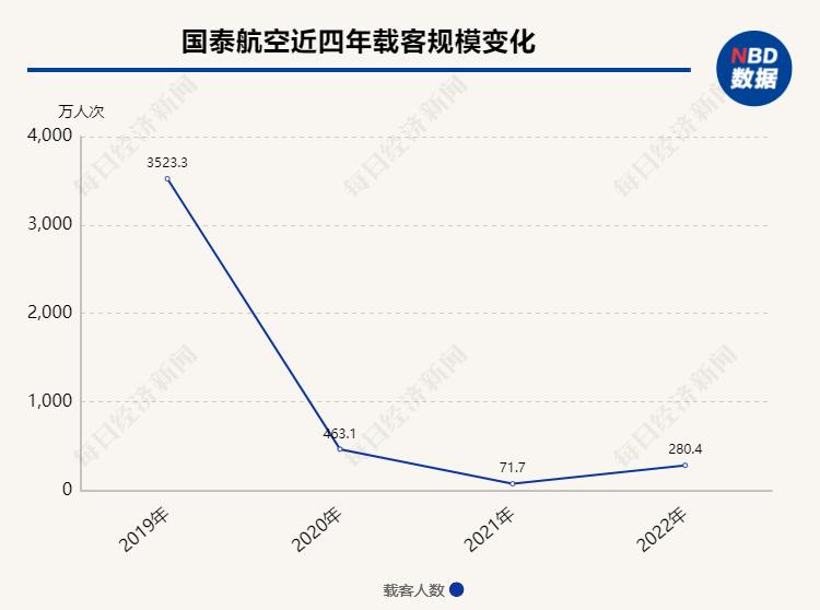 2019年,国泰航空全年的载客人数为3523.3万,相比于中国内地航司,是介于海航控股(同期载客量为8000万级别)与春秋航空(同期载客量为2000万级别)之间。而到了2022年,国泰航空的载客量仅为280.4万人次,不到2019年水平的十分之一,载客规模缩水九成。