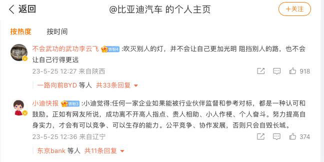 比亚迪品牌及公关处总经理李云飞在该声明下评论称:“吹灭别人的灯,并不会让自己更加光明,阻挡别人的路,也不会让自己行得更远。”
