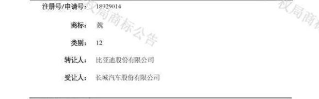 2021年4月,商标“魏”转让申请收文,9月15日核准证明打印发送,完成了全部转让流程,由比亚迪转至长城汽车名下。