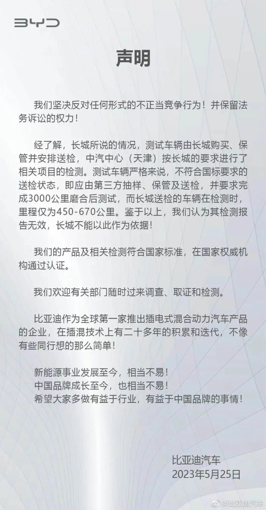比亚迪也很快做出回应,第一句话就表明了态度: