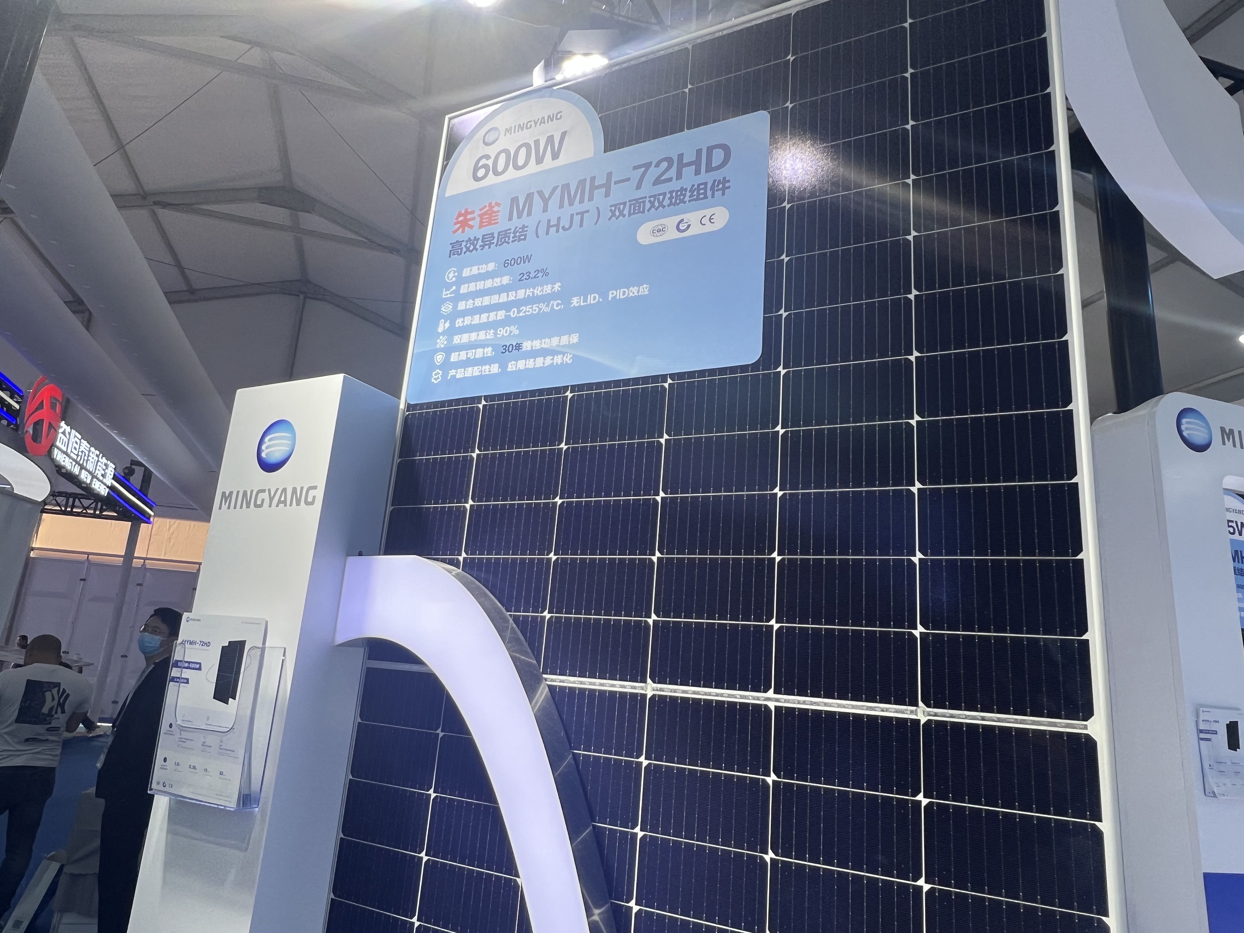 此次SNEC展会上,明阳光伏作为明阳智能旗下的光伏子公司独立参展,并首次展示了新型高效HJT光伏电池。