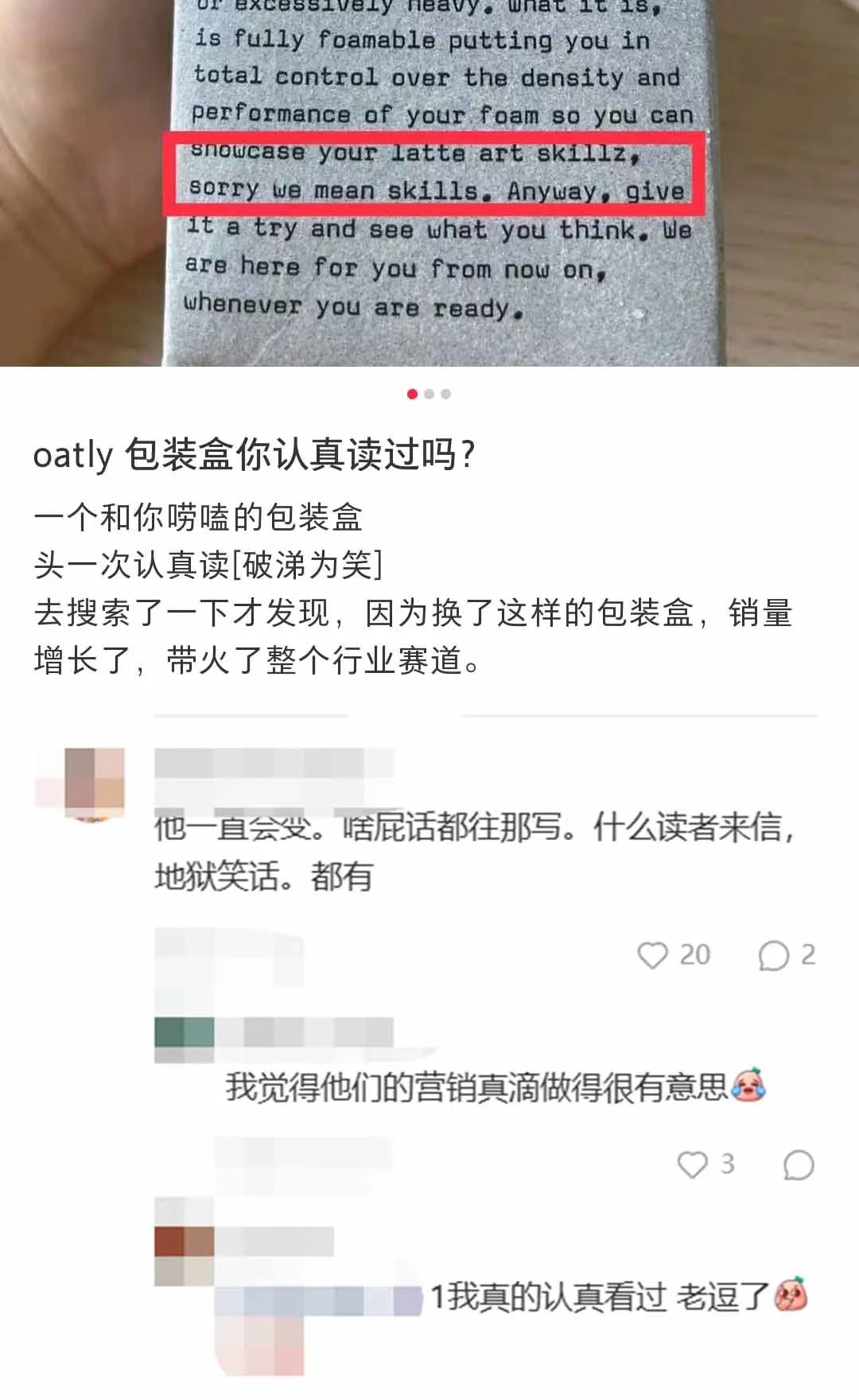 在iBrandi品创看来,有着环保、可持续理念的OATLY可以赢得大部分消费群体的好感,也能收获品牌的特定消费群体。而OATLY的产品包装更是体现了品牌的年轻化和趣味性,帮助品牌提升差异化。iBrandi品创注意到,在社交平台上,有不少网友在针对OATLY包装讨论,评价其“很有趣”、“一个和你唠嗑的包装盒”。