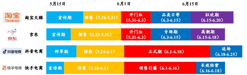 从用户端的玩法来看,今年618 整体节奏与往年相似,即5月中下旬开始预售,六月开始正式售卖且有分阶段递进,而且京东和淘宝天猫在活动的时间点也基本重合。