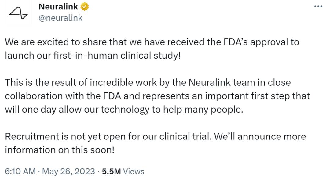 北京时间 5 月 26 日,由埃隆·马斯克联合创立的脑机接口公司 Neuralink 宣布重大进展:公司已获美国食品和药物管理局(FDA)的批准。这意味着他们可以开始在人体上做临床试验了。