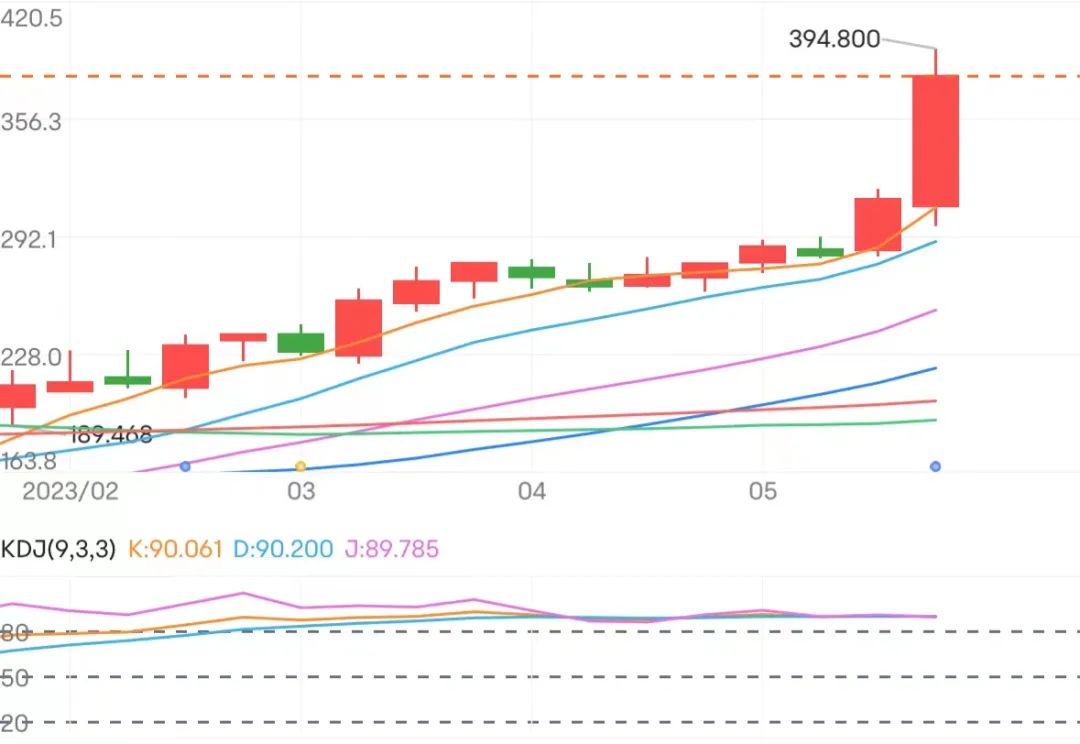 更令市场兴奋的是,英伟达预计第二财季营收将达到 110 亿美元(上下浮动 2%),同比增长 64%,是华尔街预期的 1.5 倍,这将创下英伟达有史以来最高季度营收。业界对于这样的业绩指引大为震动,驱动了股价暴涨,从开盘的 309 涨至盘中的 394,最后以 379.8 收盘,业内感叹:市值万亿美金级别的企业,单日还能暴涨 25% 也是活久见了。