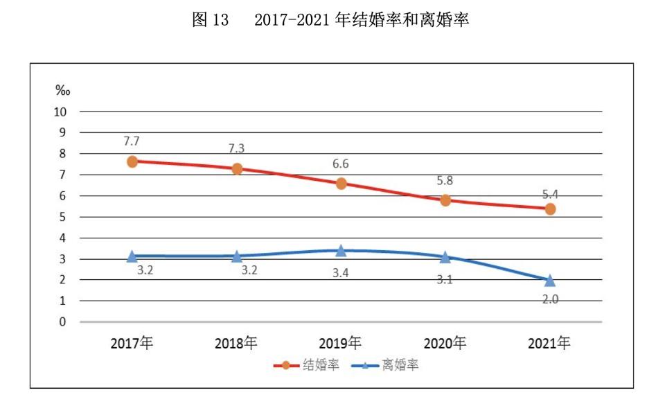 2017-2021年结婚率和离婚率,图源《2021 年民政事业发展统计公报》
