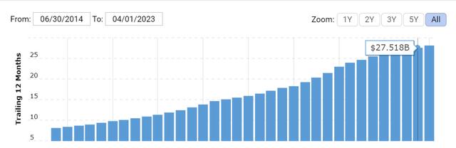 事实上,“仍处于低谷”一词可能表明他们至少保持了地位,但实际上他们仍在失势,因为 PayPal 股价年初至今下跌近 17%。尽管该公司的收入在近十年的任何连续 12 个月内随着时间的推移而增加,如下所示(以十亿计)。