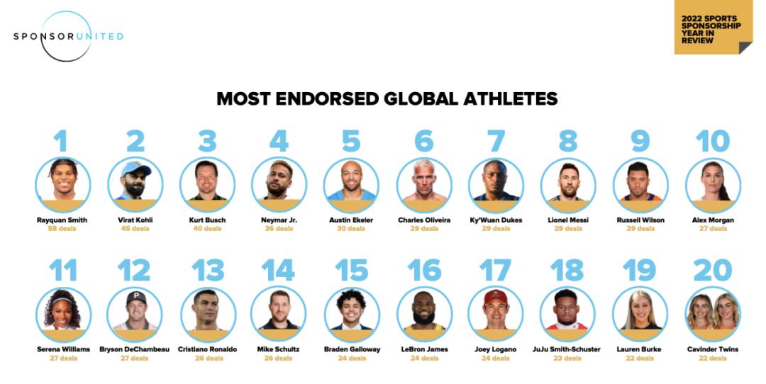 在运动员层面,2022年全球运动员品牌代言和媒体交易增长了20%。最受欢迎五大运动员总共拿到209笔赞助。与品牌交易最多的运动员是大学生田径/橄榄球网红雷昆·史密斯(Rayquan Smith),截止2022年末,他手握58份品牌代言/合作协议,是梅西的2倍。