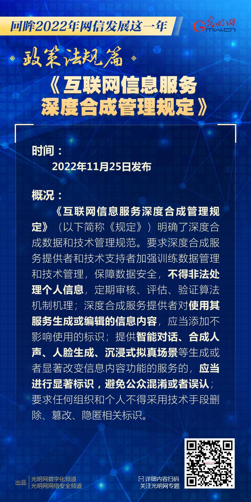 去年 12 月,《互联网信息服务深度合成管理规定》发布,对人脸生成、替换、操控,合成人声、仿声等深度合成内容都有明确约束。