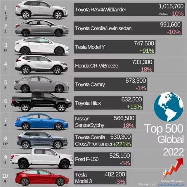 其中丰田 RAV4 和卡罗拉则以 101.57 万辆和 99.16 万辆卫冕全球车型榜单的冠亚军。